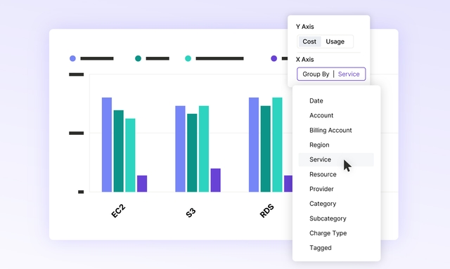 Choose date or any other dimension, like service, provider, charge type, or team tag, for your Cost Report X axis.