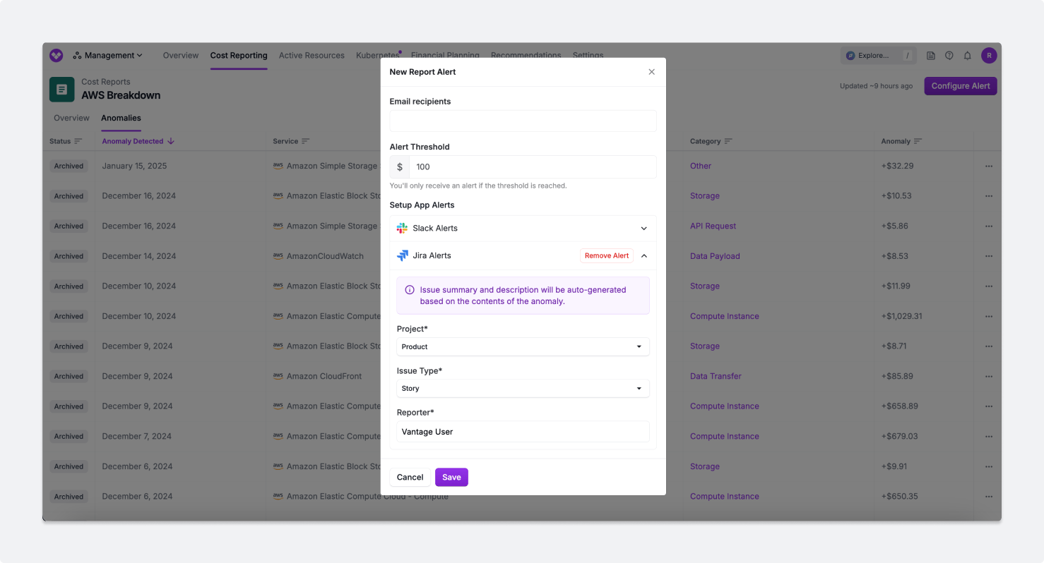 - Cost Anomaly Alerts: In the Anomalies tab of a Cost Report, a Cost Anomaly will display a link to a Jira issue if one was created.
