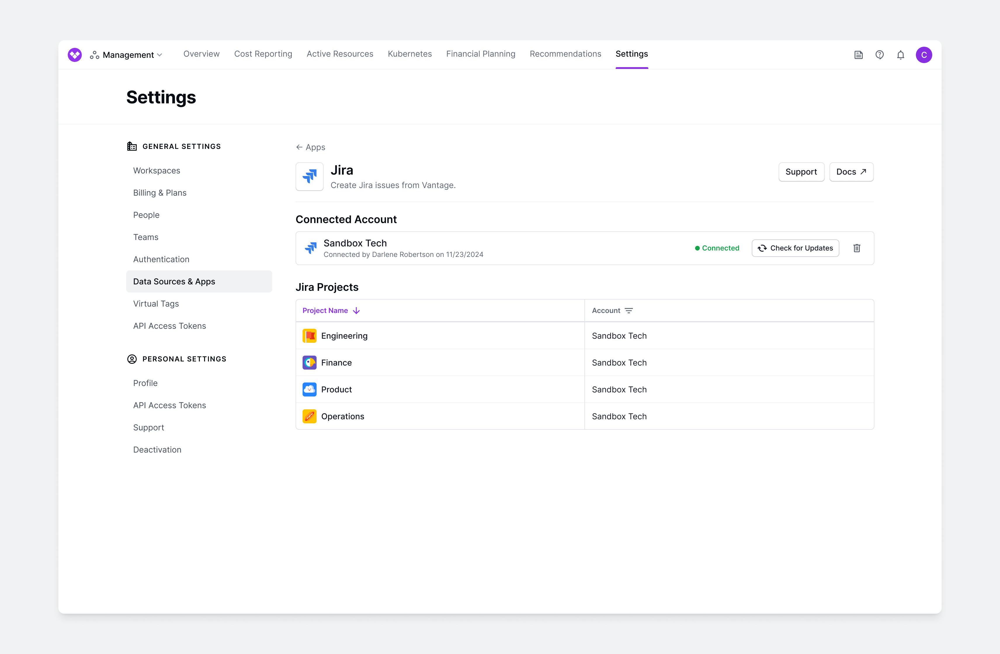 This feature is now available to all Vantage customers. To get started, navigate to the Integrations page in the console, and under the Apps section, select Jira. To learn more about how to get set up, see the Vantage documentation.