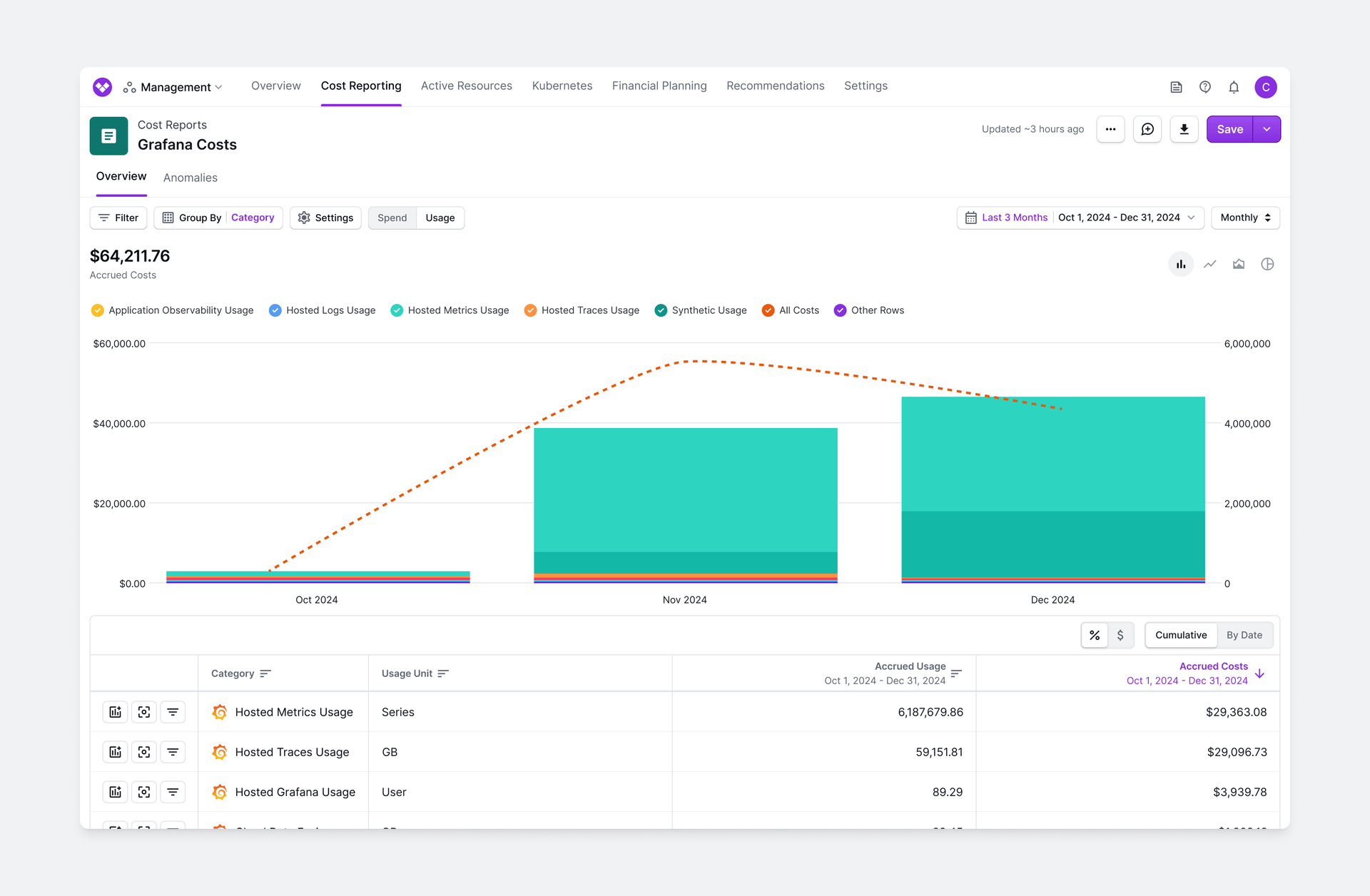 - Category (Specific usage category, like Hosted Metrics Usage or Hosted Logs Usage)
