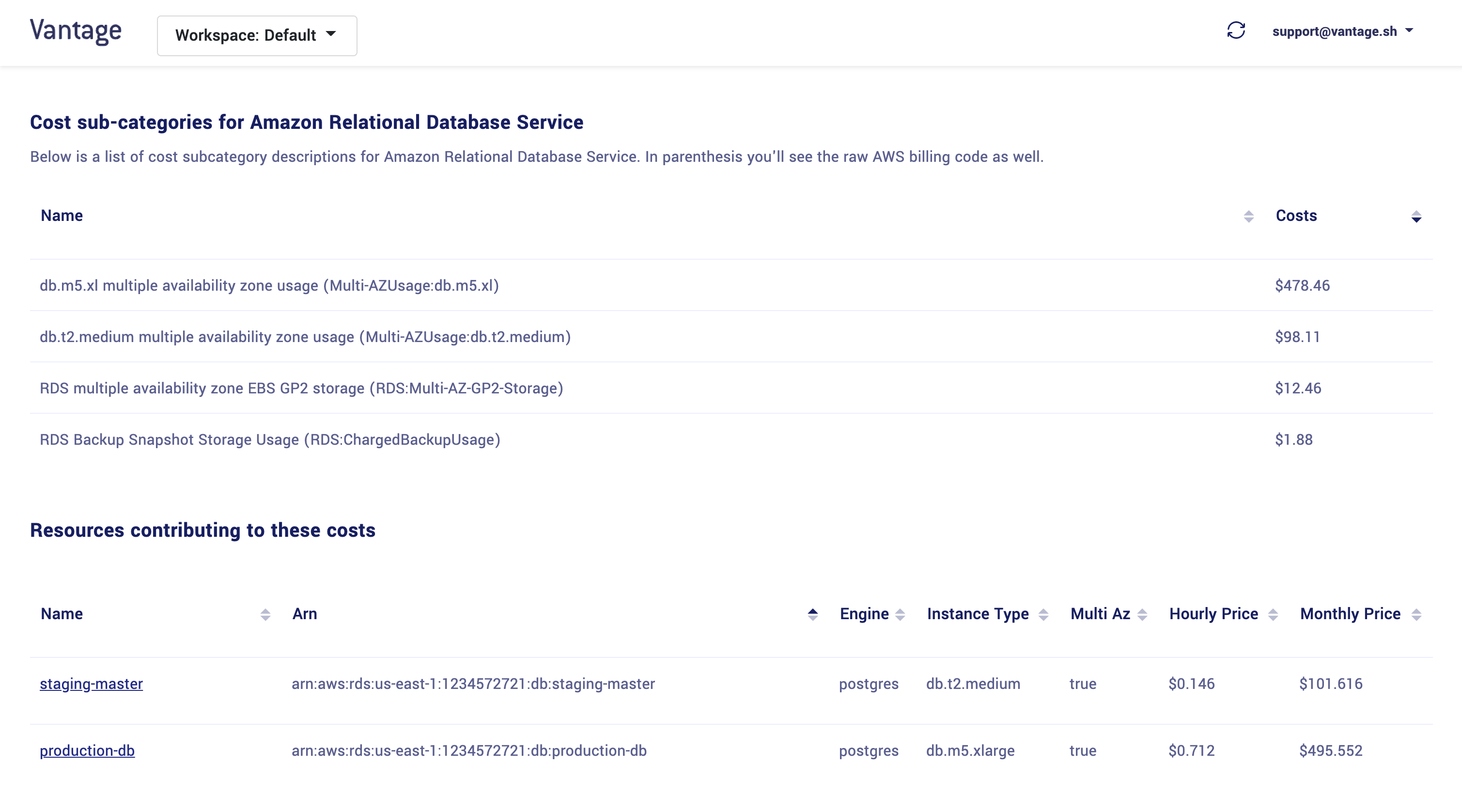 How are cost subcategories and values determined?Vantage securely connects with your AWS account and connects with various service and billing APIs to retrieve this data. The values listed are based off of actual usage data from your AWS account and are not estimates.