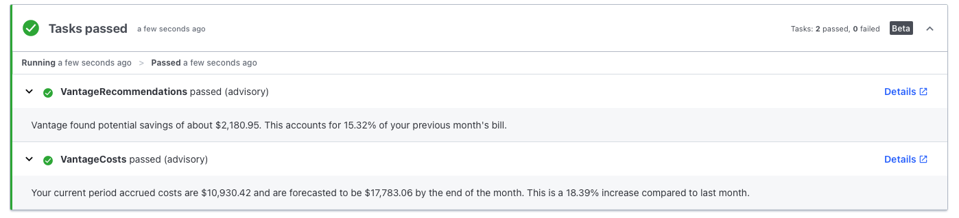 HashiCorp’s new Run Tasks API gives Terraform Cloud customers the ability to integrate third party services to post relevant information back to Terraform Cloud. As a result, customers can quickly associate a Vantage workspace with a Terraform Cloud workspace and, as often as a run is done, Vantage can post two types of advisory summaries.