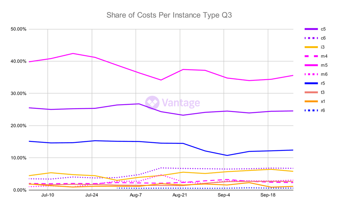 Although newer generation instances have often been available for a while, companies are slow to move to them. In our data the c5, m5, and r5 instances make up the vast majority of compute costs, with c6, m6, and r6 instances only beginning to make a dent this past quarter.