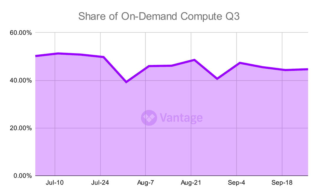 On-demand compute costs are decreasing as a percentage of total compute spend, despite still being at relatively high levels in aggregate. On-demand compute as a share of costs has decreased from 50.19% a year ago to 44.66% at the end of Q3.