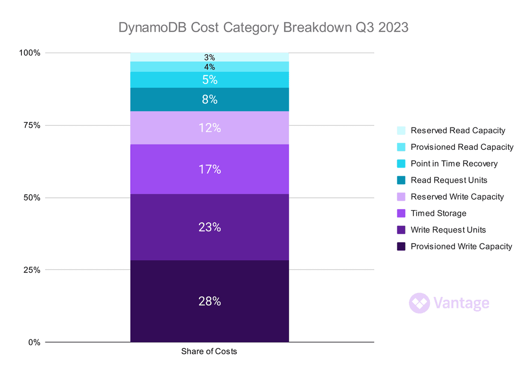 Provisioned Write Capacity and Provisioned Read Capacity represent just over a third of all costs this quarter. Provisioned throughput offers cost advantages when your reads and writes are consistently distributed over time. It is typically the ideal choice for fluctuating or unpredictable workloads, as any activity beyond the provisioned threshold will result in failures.