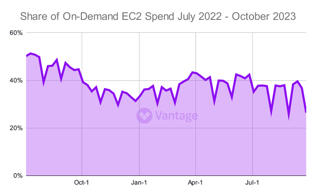 EC2 On-Demand spending dropped to an average of 35% in the past quarter. This is a significant improvement from the 47% spending average in the same quarter last year.
