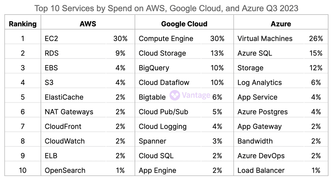 Fresh off the quarterly earnings for Microsoft, Google, and Amazon—where companies continue to focus on cost optimization—we are releasing the Q3 2023 Cloud Cost Report, an analysis of cloud usage based on anonymized Vantage customer usage. Vantage is a cloud cost management and optimization platform, with a unique view into industry trends, thanks to tens of thousands of connected infrastructure accounts across 12 cloud providers. To discuss this report in more detail, join our growing Slack Community of over 1,000 engineering leaders, FinOps professionals, and CFOs. View past reports here.