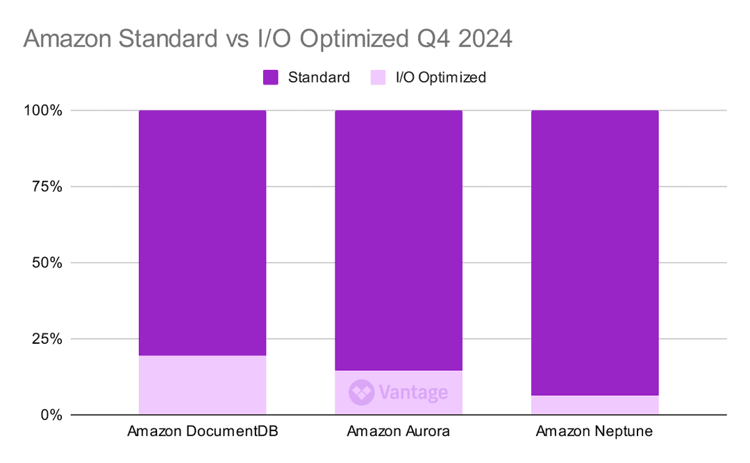 For DocumentDB, Aurora, and Neptune, users are predominantly choosing the Standard payment plan, with I/O Optimized adoption remaining relatively low across all three services. However, many production workloads have I/O requests that exceed 25% of spend. In such cases, switching to I/O Optimized could result in meaningful cost savings.