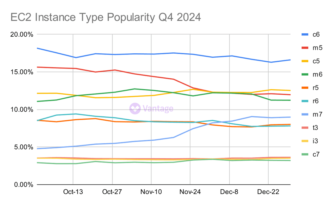 EC2 users continue to gradually modernize their compute infrastructure. As predicted last quarter, m6 surpassed m5 usage at one point, as users opted for more efficient and cost-effective instances.