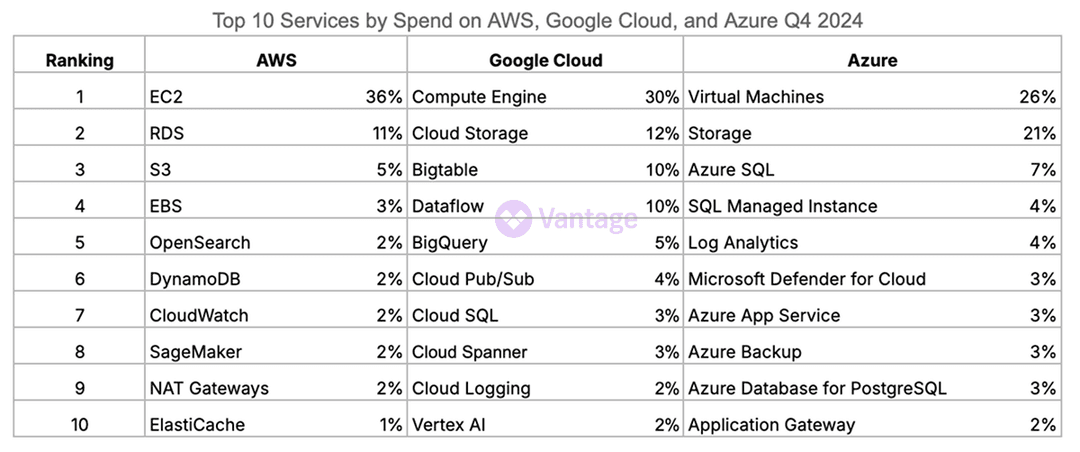 Compute, storage, and databases remain the pillars of the three main cloud providers—AWS, Google Cloud, and Azure. However, the impact of AI is becoming more apparent with Sagemaker at number 8 for AWS spend and VertexAI at number 10 for Google Cloud spend.