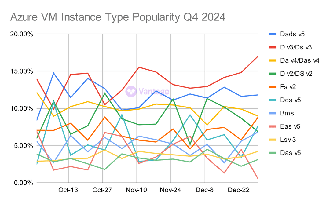 Azure VM usage shows significant volatility in Q4 2024, with notably more distributed usage across instance types compared to earlier in the year. The general-purpose D family remains the most popular choice due to its performance balance and range of use cases