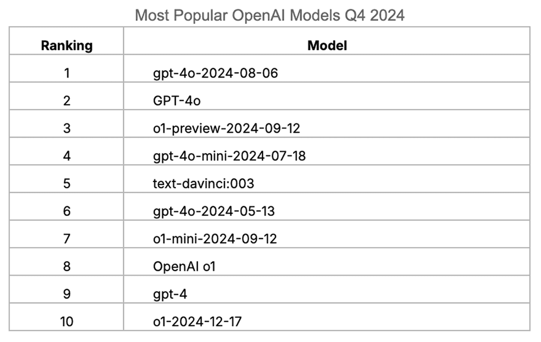 Looking at the most popular models by spend, the newly released GPT-4o and OpenAI o1 are the most popular. The presence of recent release dates indicates a different pattern from traditional cloud services like Amazon EC2, where users gradually upgrade to newer generations. Instead, AI users are actively experimenting with and adopting the latest models, quickly gravitating toward the newest and most powerful options available.