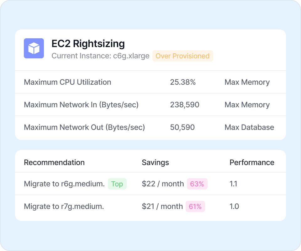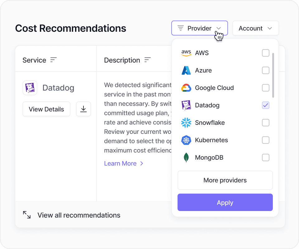 Vantage integrates with hundreds of provider cost and usage APIs to provide more savings recommendations than any other vendor. See the full list of cost saving recommendations below.