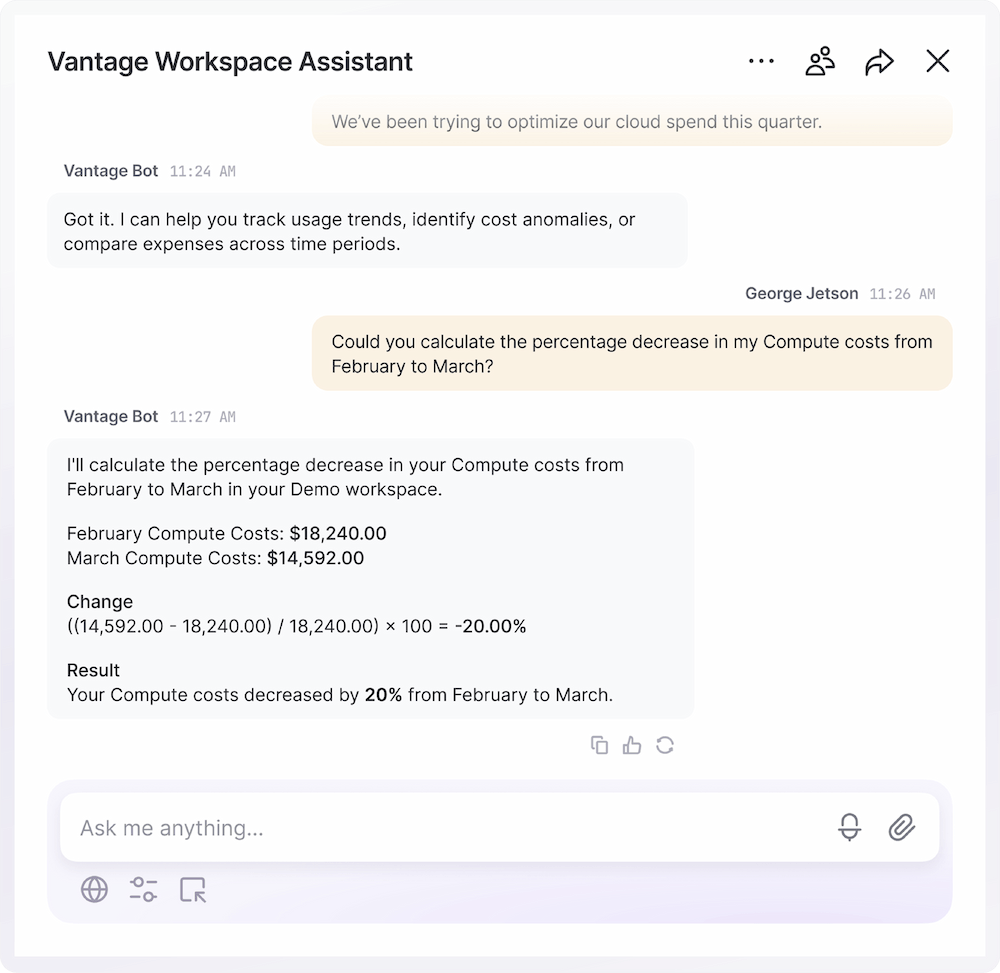 Enable anyone in your organization to understand cloud costs. Invite engineering, finance and management constituents to easily interact with your structured cost data via a conversational interface.