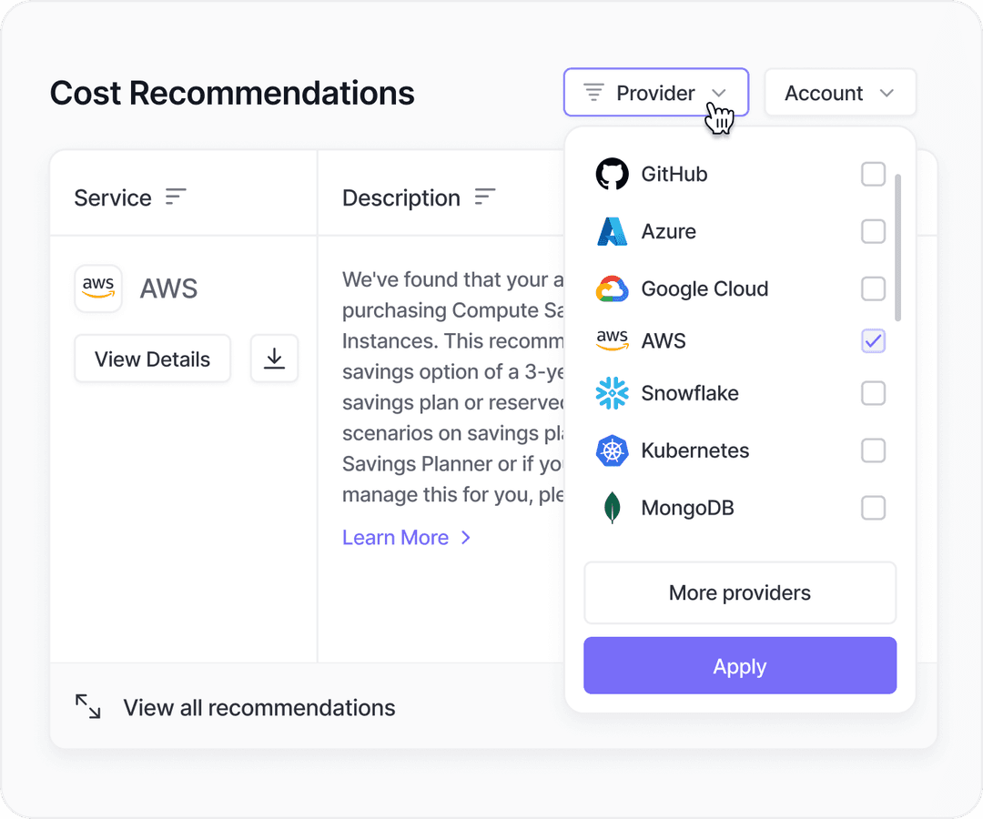 Connect Vantage in minutes for more granular, actionable, and automated cost insights than AWS Cost Explorer