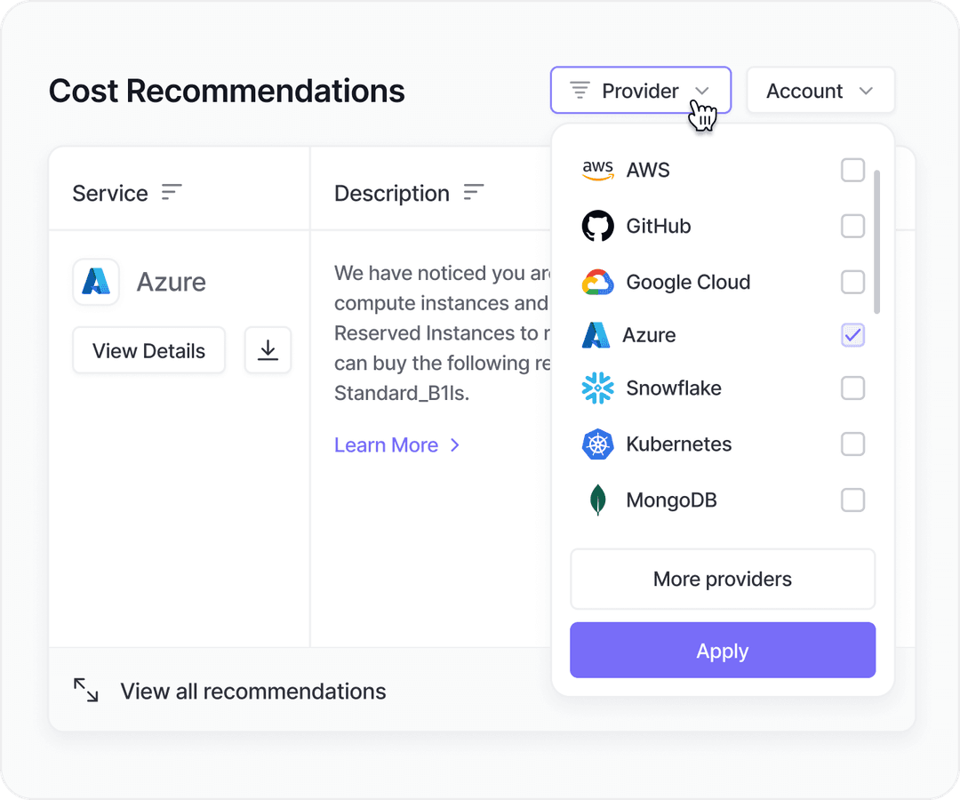 Vantage integrates with your Azure account using an Active Directory service principal. Once connected, cost and usage data is automatically ingested, and cost recommendations are generated right away to help you identify savings opportunities.