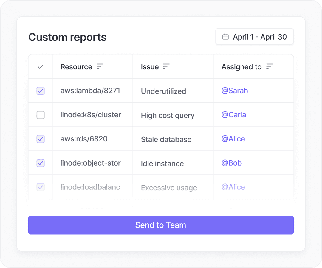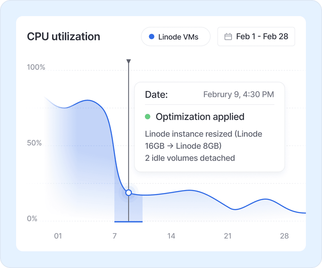 Filter and group spend across Kubernetes Clusters, Linode Instances, Node Balancers, Object Storage, Images, Storage Volumes, and more. Get clear visibility into which services are driving your costs, and where to optimize.