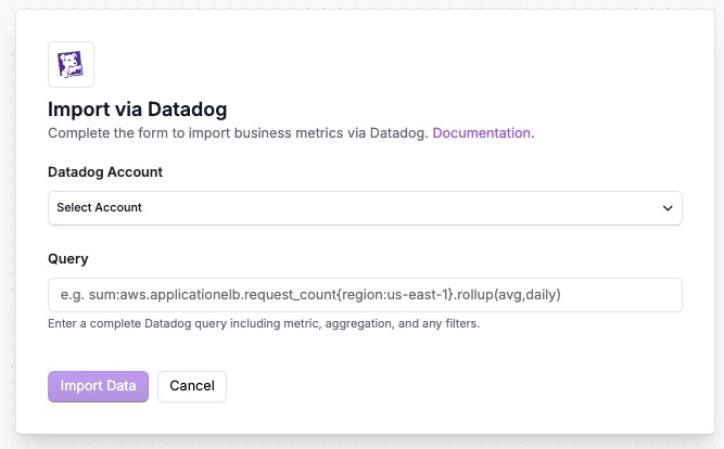 No changes are required for existing Datadog Business Metrics. Your existing Datadog queries are stored as raw queries in Vantage. When editing an existing business metric, the raw query field will be prefilled with the previously imported metric query.