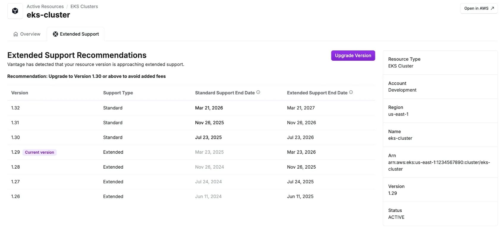 Now, with the launch of AWS Extended Support Reporting and Recommendations for EKS in Vantage, Vantage automatically annotates EKS clusters with metadata in Active Resource Reports indicating their current support type—Standard or Extended—and the support calendar with end dates of each support phase. Customers can leverage this information to filter and create views of clusters based on their support status or End of Support dates, facilitating timely upgrades and cost avoidance. Vantage will guide engineers as to what version they need to upgrade to in order to avoid additional charges, as well as provide direct linking to the AWS console to perform the upgrade. Additionally, Vantage will provide recommendations for clusters currently incurring Extended Support fees and those set to enter Extended Support within the next three months.