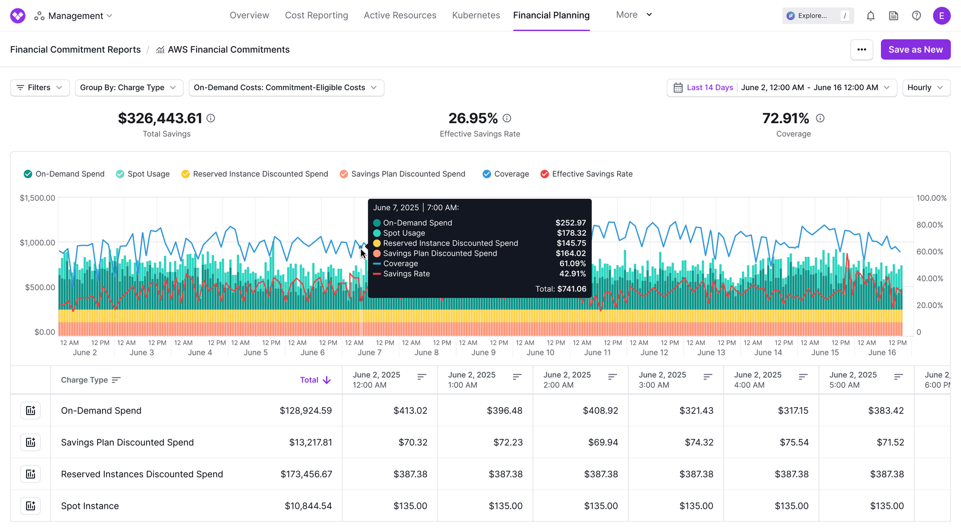 Vantage is launching Hourly Granularity for Financial Commitment Reports, which allows customers to analyze committed spend, coverage, and effective savings rates by the hour for any 14 day period.