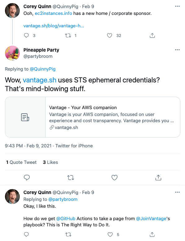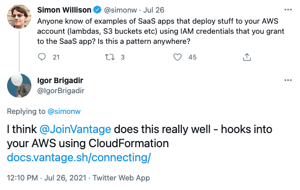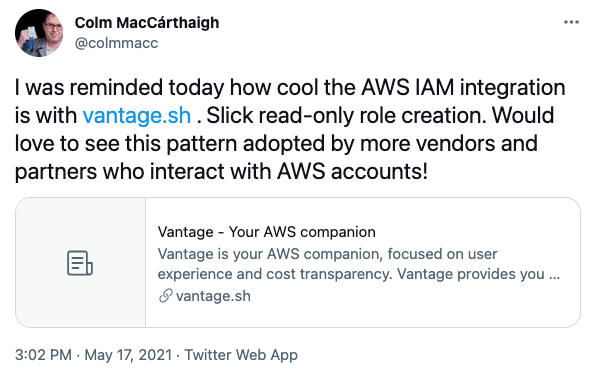 From the beginning of Vantage we have had the need to connect to our customer's AWS accounts to interact with AWS services, ingest cost data and potentially take actions on resources within their account. Developing a product which has direct access to a company's infrastructure requires diligence and we take this responsibility very seriously. We've invested considerable time and effort into ensuring the mechanics of our integration is secure and we thought the community would benefit from us sharing our approach.
