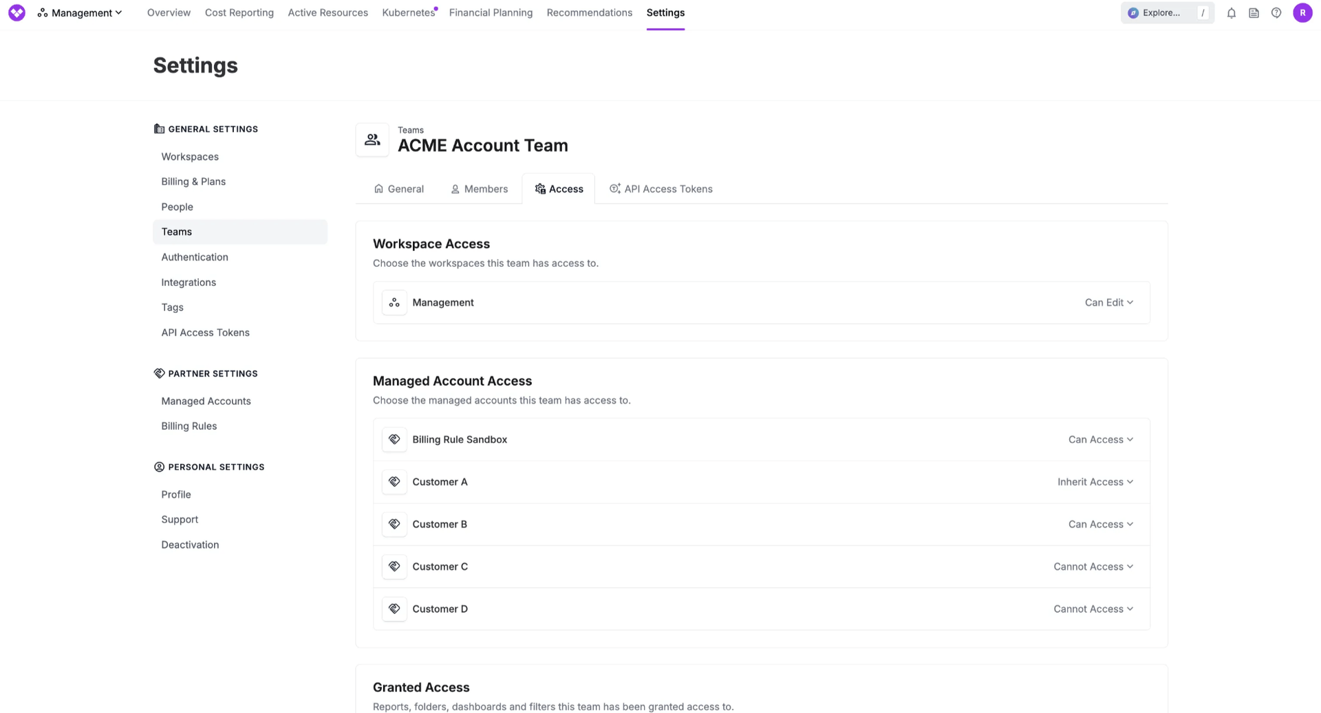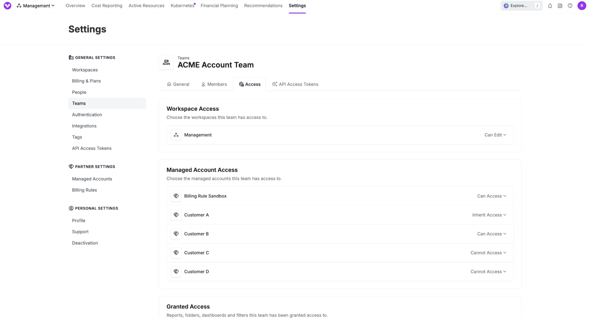 Now, Vantage MSP Customers can use RBAC to assign access to Managed Accounts through Teams. When a user is viewing the Partner Settings in the Management Account, they will now see only the Managed Accounts they have permissions to view based on the Teams they are assigned to. This allows MSP Partners to assign access based on least privilege, ensuring they can only view the costs of customers that they oversee.