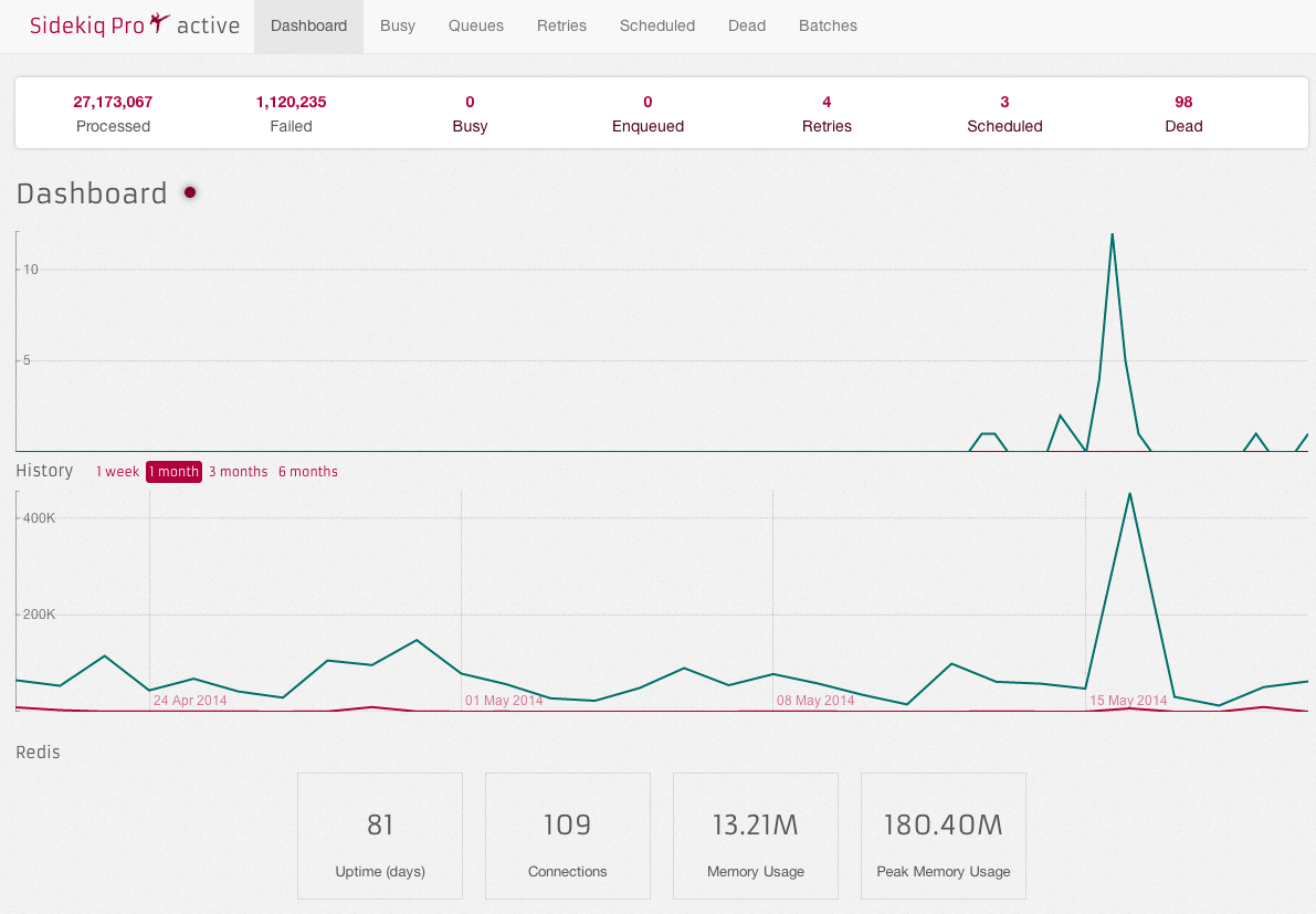 Sidekiq has a Web UI that lets you monitor job execution in real time. The dashboard displays running jobs and shows their duration and queue placement; however, it does not offer an out-of-the-box way to trace job hierarchies, meaning if one job enqueues another, there’s no direct visibility into their relationship. Another issue is that there is no record of a job’s history once complete.