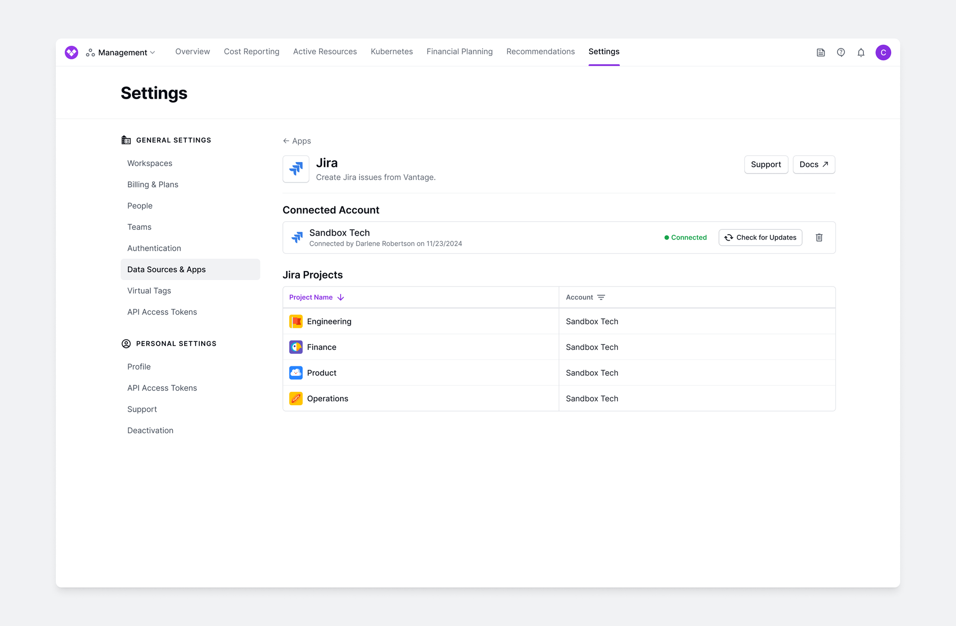 Ticket statuses are synced daily. Any configuration changes to your Jira projects, such as changes to projects, required fields, and user lists are synced during integration, and should be synced manually afterward using the “Check for Updates” button on the Jira Integration page within Settings, should you want the latest projects, issue types, required fields, or users to appear in Vantage.