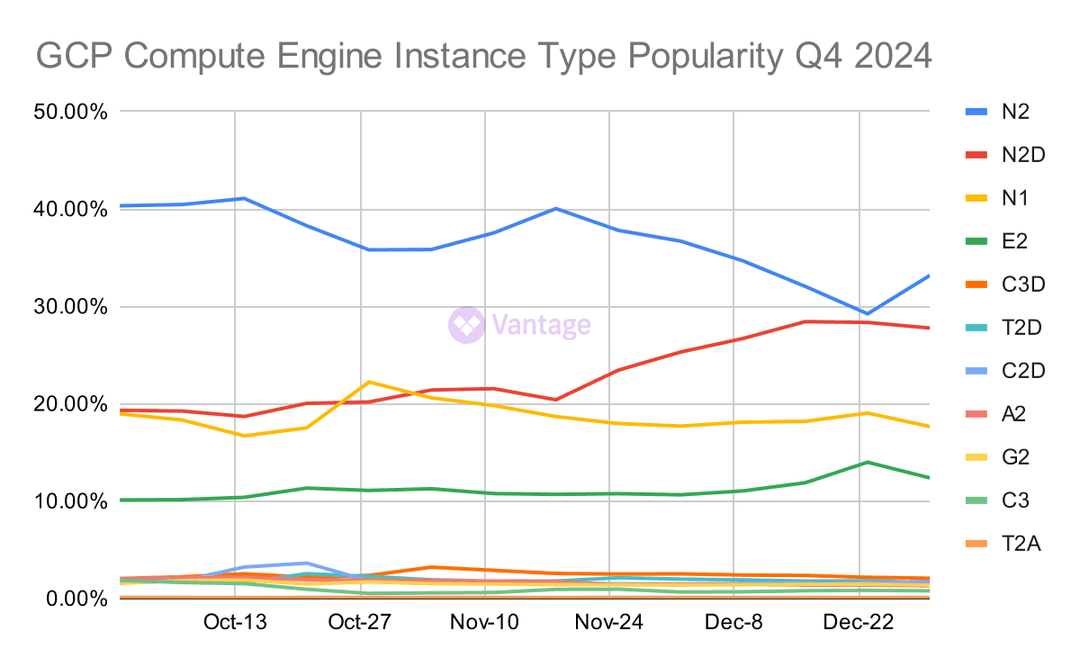 Google Cloud's N-series instances continue to dominate compute usage, with N2 and N2D together accounting for over 50% of instance usage. This, however, is down from earlier in the year when N2 and N2D accounted for about 80% of the spend.