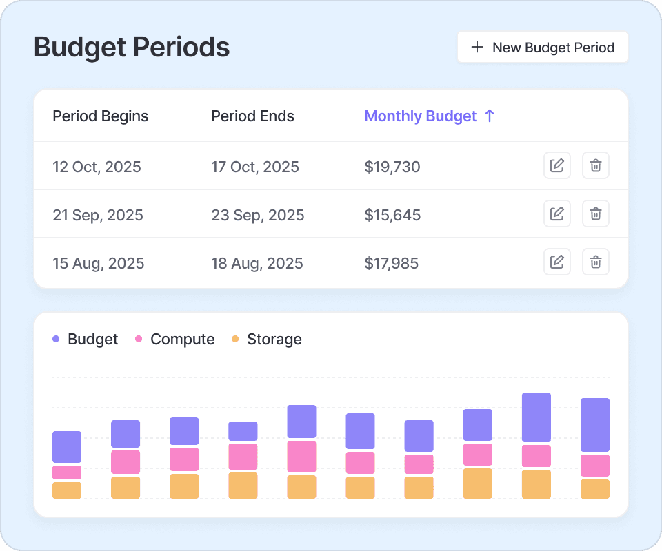 Configure once, monitor forever. Create, assign, and track every cloud budget from a single command center.