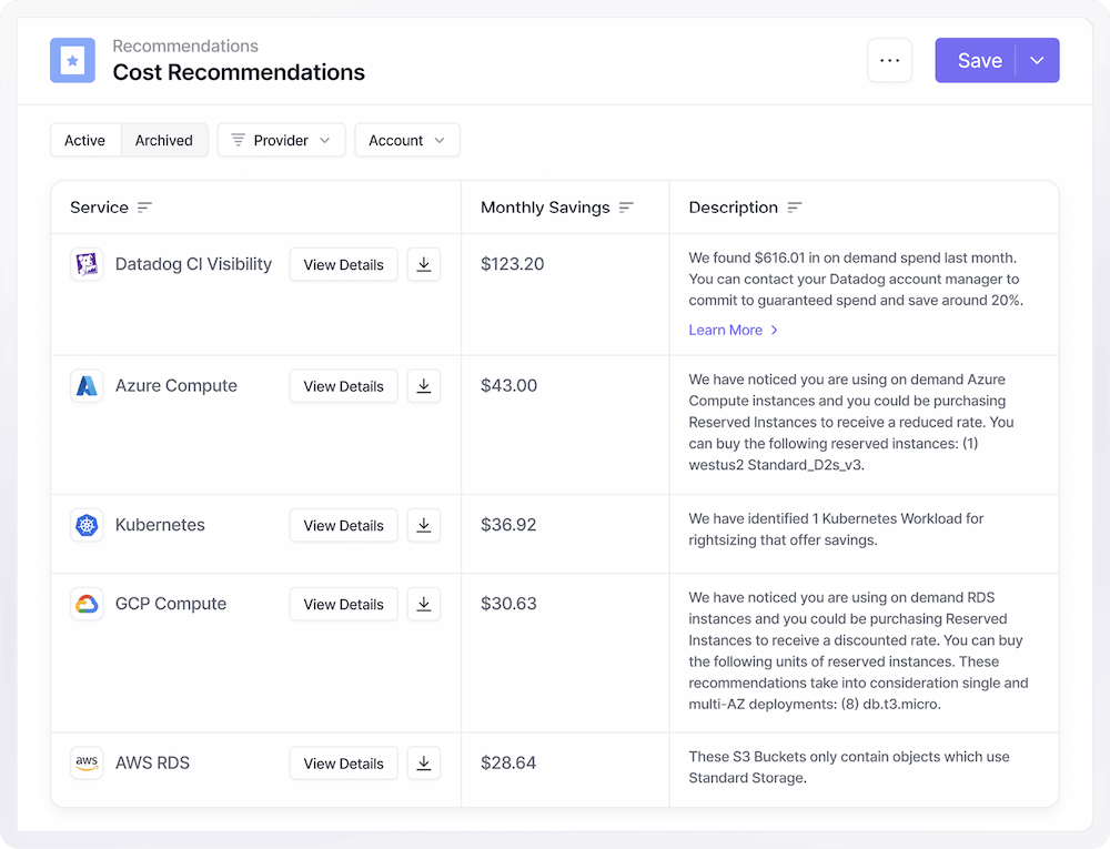 Vantage integrates with hundreds of provider cost and usage APIs to provide more savings recommendations than any other vendor. See the full list of cost saving recommendations below.