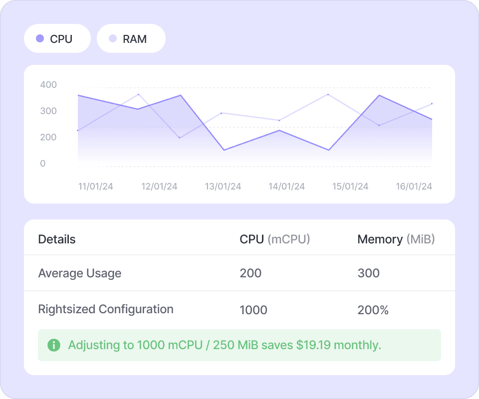 If you use Kubernetes, Vantage will show you pod rightsizing recommendations without any additional configuration. See exactly which Kubernetes workloads are least efficient and identify which clusters may be idle.