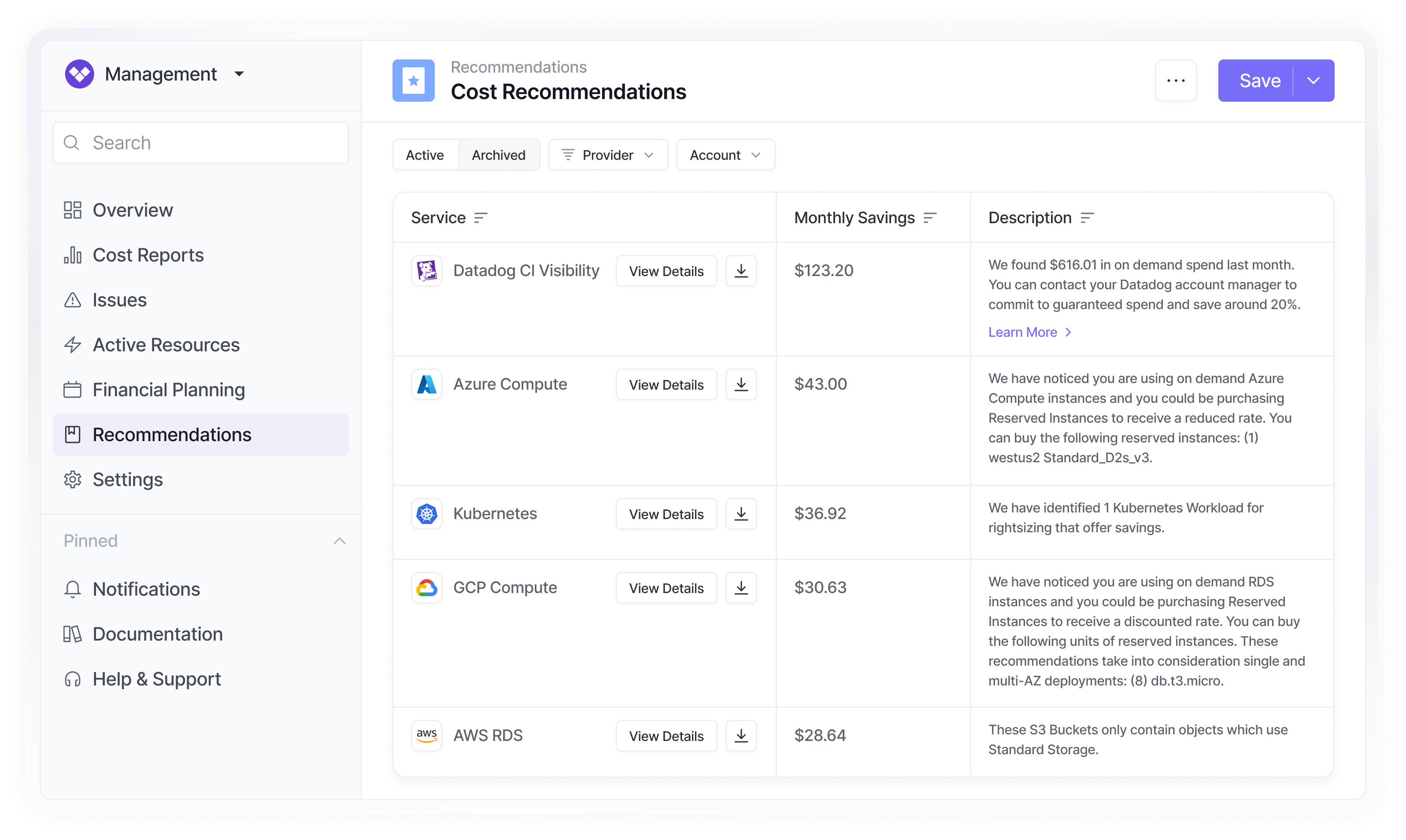 Vantage integrates with hundreds of provider cost and usage APIs to provide more savings recommendations than any other vendor. See the full list of cost saving recommendations below.