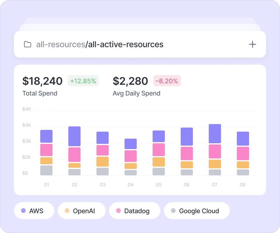 Vantage integrates with service APIs to show you a snapshot of all active resources driving costs. Get a full inventory of every offending resource.