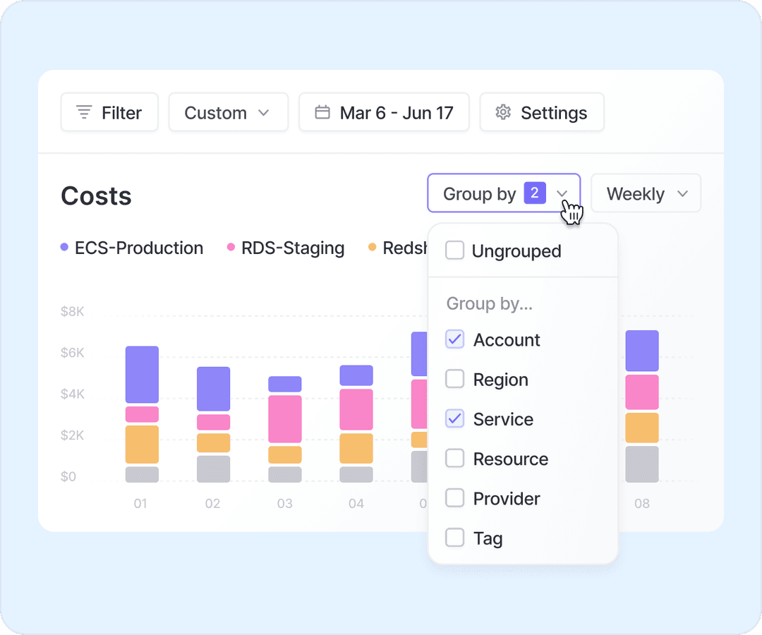 Vantage identifies which exact resource, service or member account is driving costs through an easy to use, modern interface.