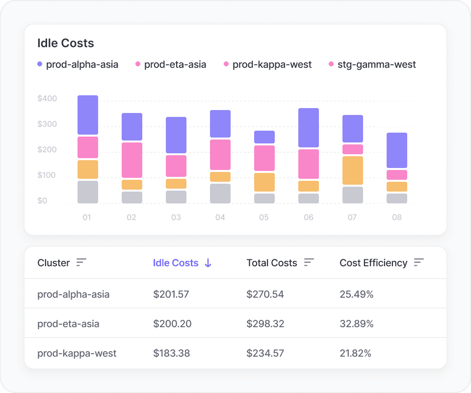 Get pod rightsizing recommendations to quickly update pod specs. Adjust cluster size by seeing the cost of cluster idle waste.