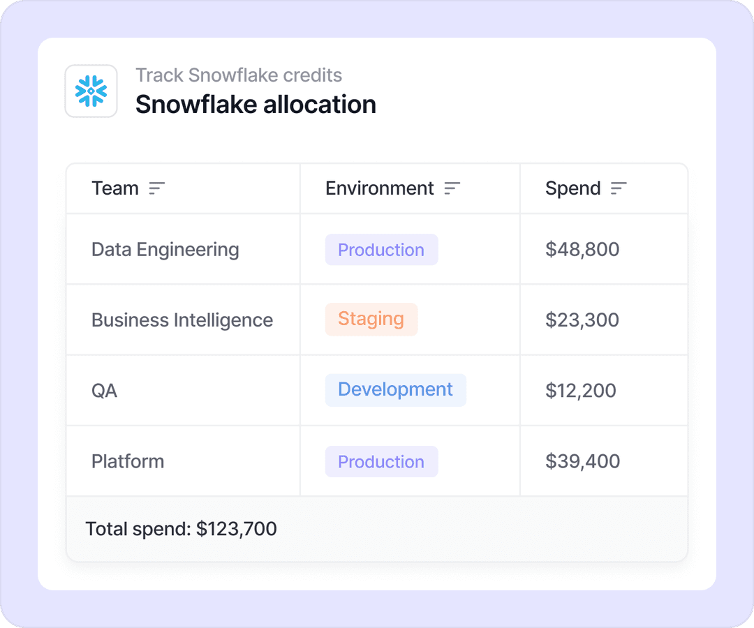 Monitor Snowflake together with AWS, Azure, GCP, and more in one platform built for total cost visibility.